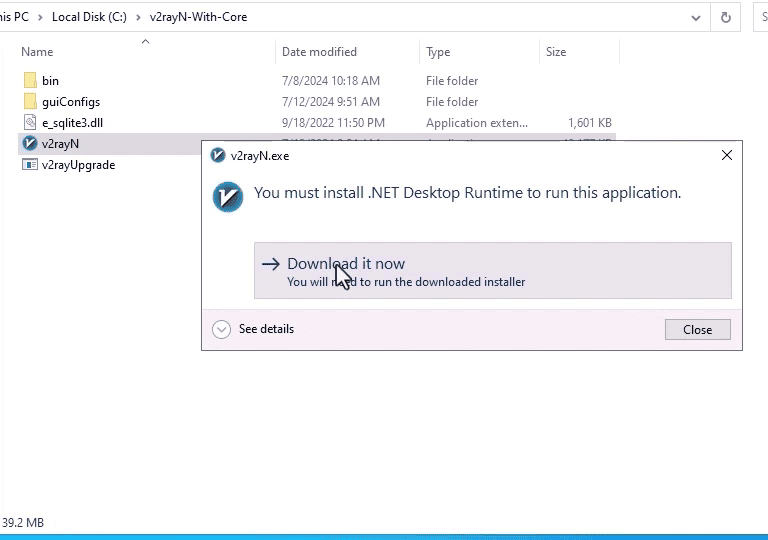 سپس وارد فولدر برنامه شوید و v2rayN را اجرا کنید. در صورتی که .Net Desktop Runtime 8 را در سیستم عامل نصب نکرده باشید طبق تصویر پیغامی مشاهده خواهید کرد. در این صورت روی "Download it now" کلیک کنید و .Net Desktop Runtime 8 را دانلود و نصب کنید و بعد از نصب آن v2rayN را اجرا کنید.